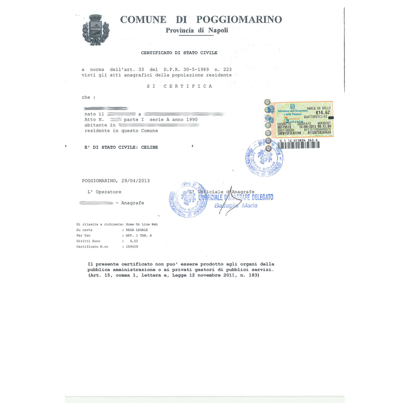 Os pongo aquí varios ejemplos de «Certificato di stato libero» en el que se han eliminado los datos personales de los interesados: